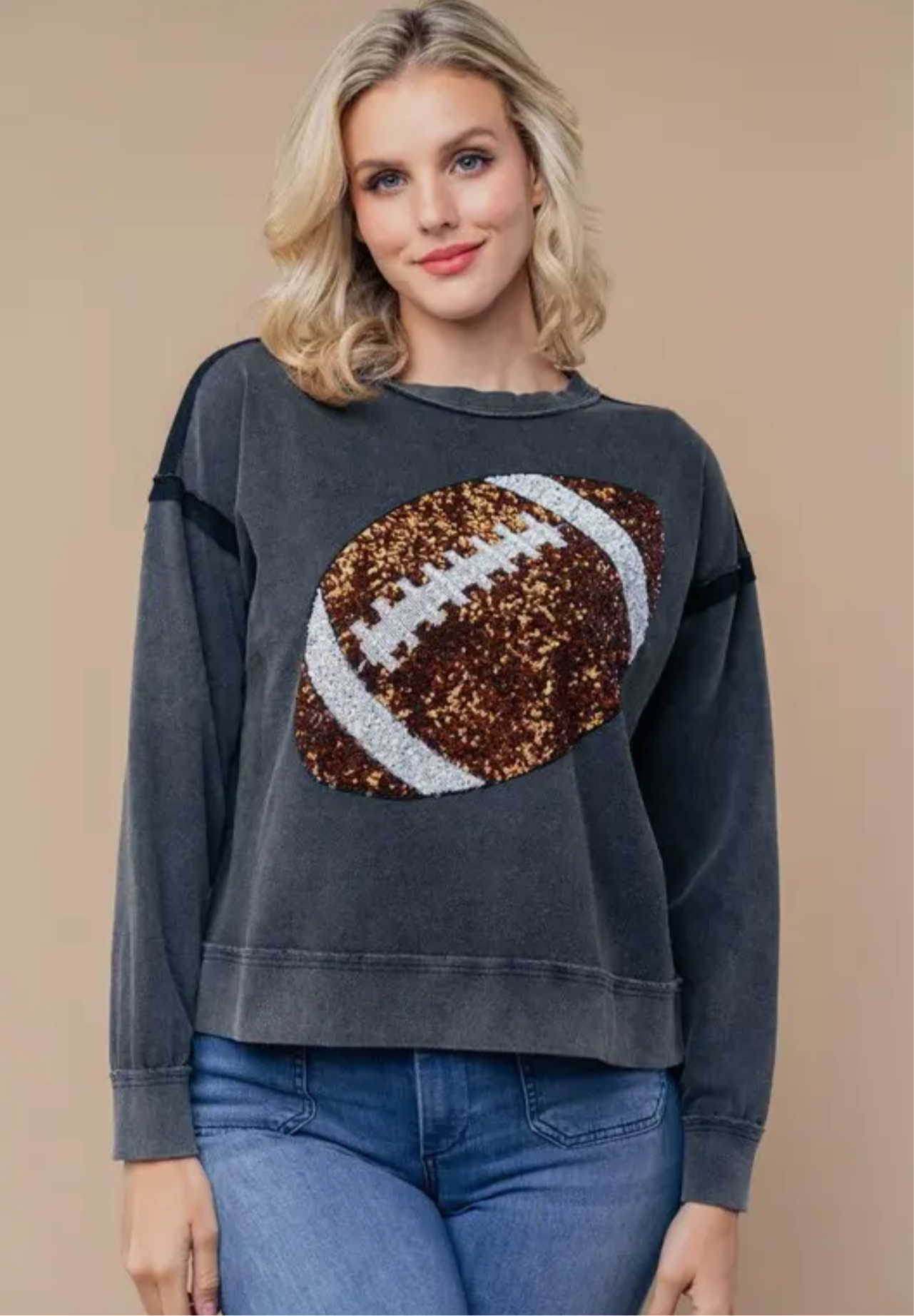 Be sure to cheer on your favorite team with our sequined football black long sleeve top for any game of the season! True to size.Β